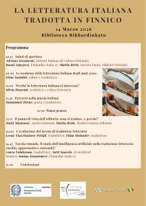 L’associazione Finlandia-Italia ry e il Presidio letterario della Società Dante Alighieri Helsinki organizzano, in collaborazione con la Biblioteca Municipale di Rikhardinkatu, un seminario sulle traduzioni della letteratura italiana in Finlandia. Durante l’incontro, interverranno scrittori, poeti, editori e traduttori che si confronteranno sul tema della traduzione letteraria di opere italiane in finnico. L’evento si svolgerà in […]